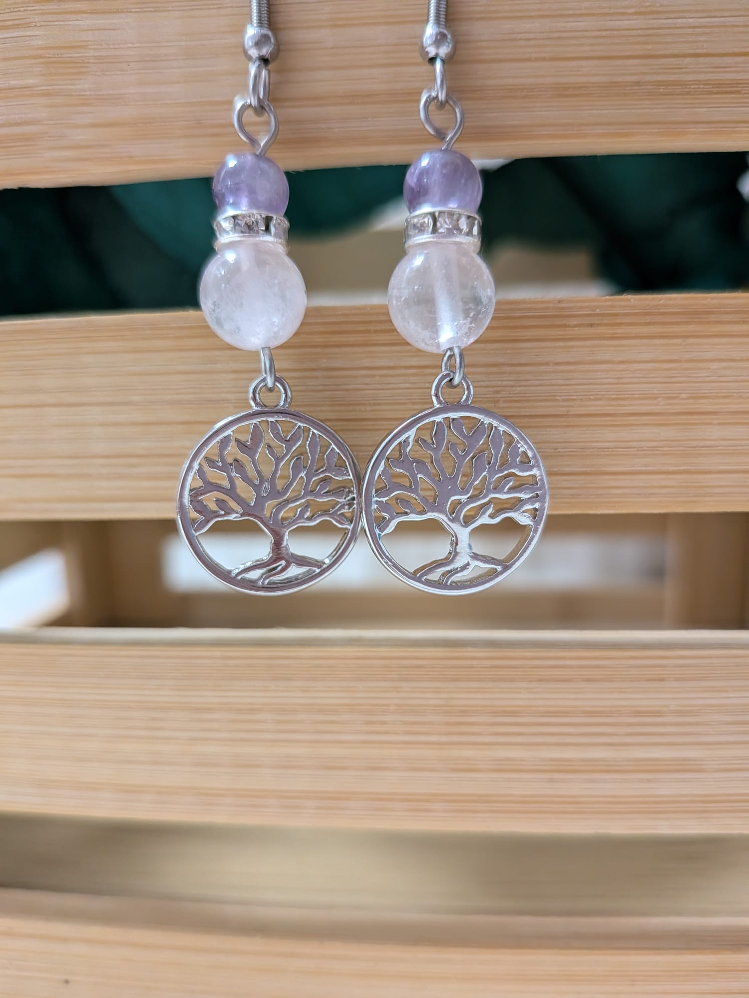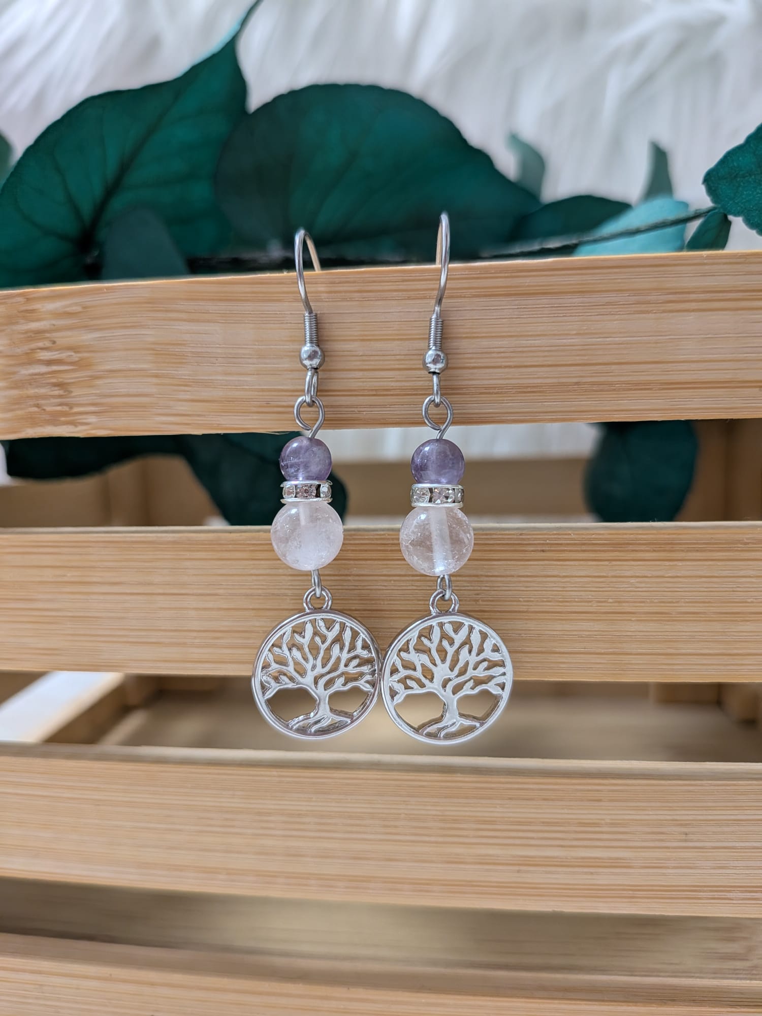 Ces boucles d’oreilles associent l’énergie apaisante de l’Améthyste à la douceur du Quartz rose, sublimées par un arbre de vie en laiton, symbole universel d’équilibre, de croissance et d’ancrage.