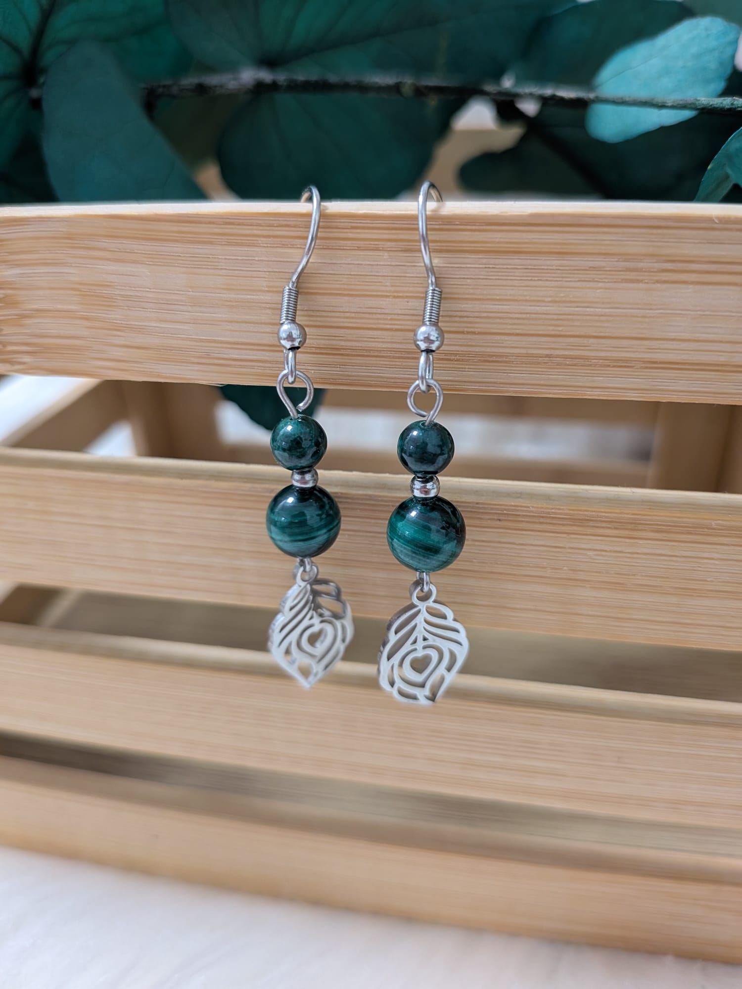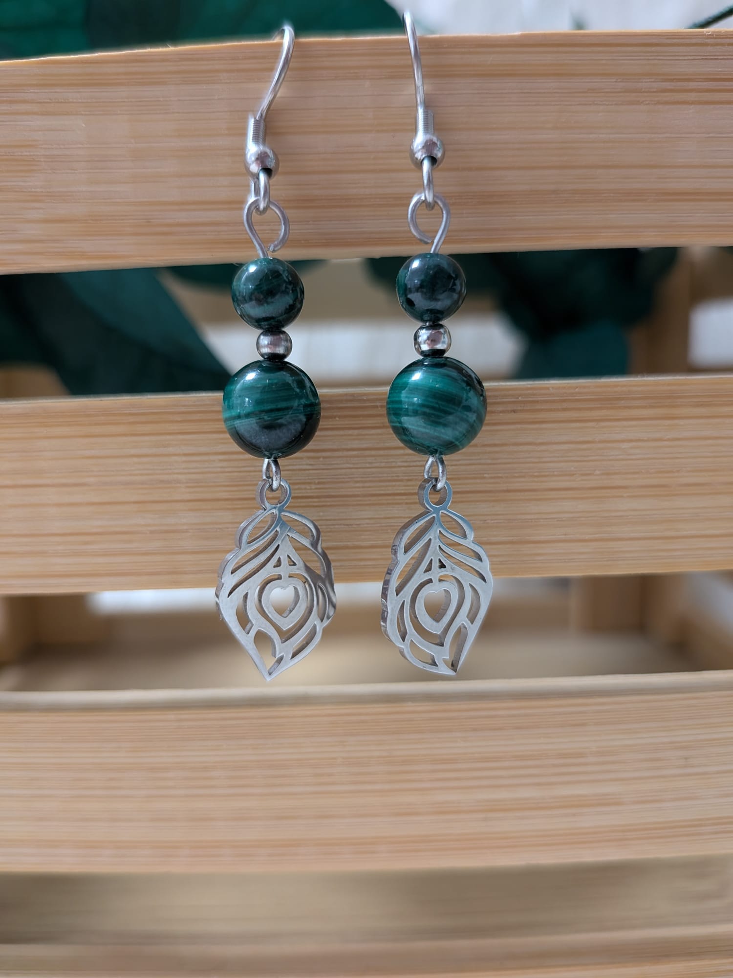 Les boucles d’oreilles Malachite feuille cœur en acier inoxydable allient la beauté intense de la Malachite à une délicate breloque en forme de feuille ornée d’un cœur.